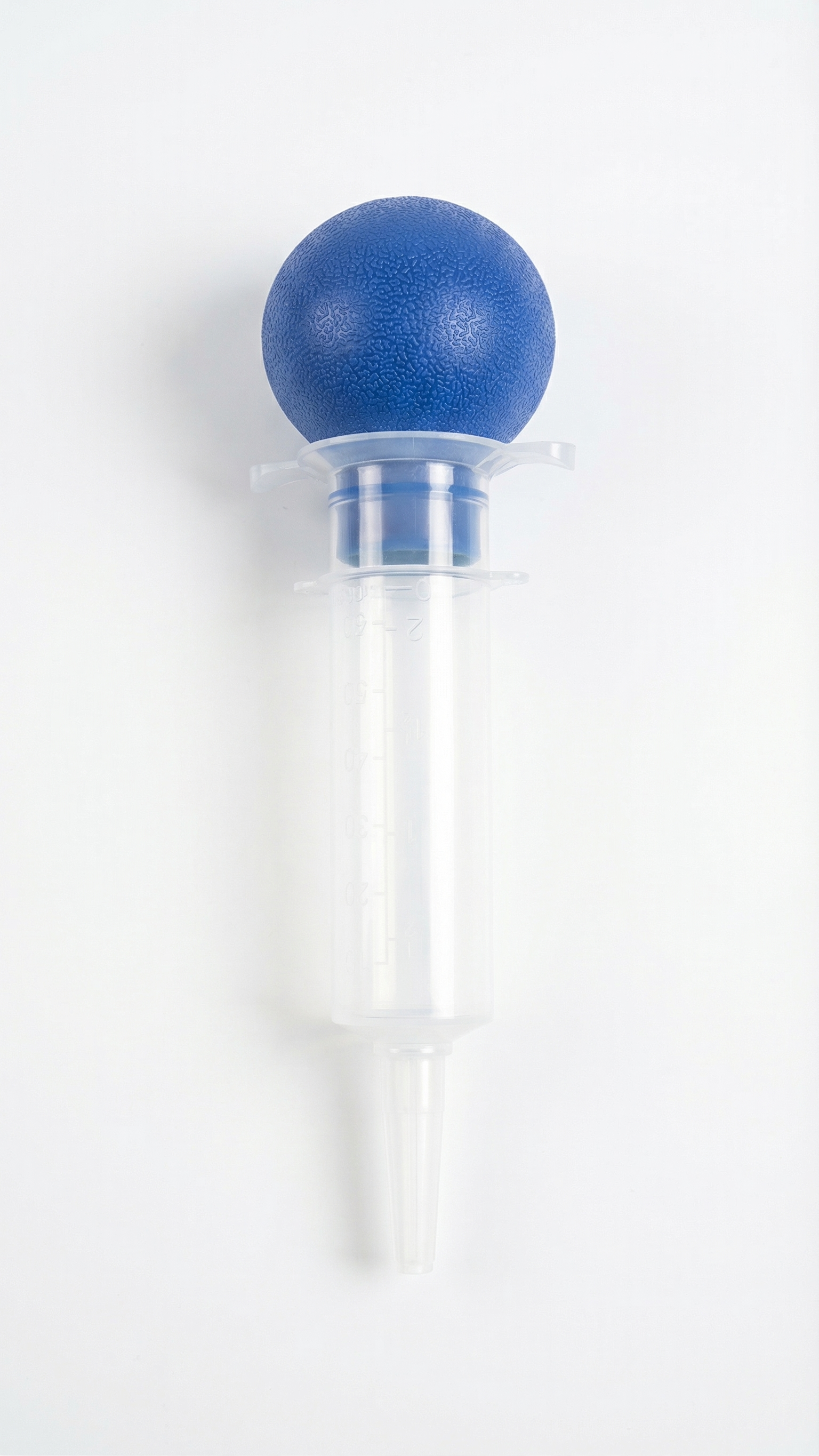 · Structure: Composed of a blue non-slip bulb, a transparent graduated syringe barrel, a conical tip, and side wing handles. The entire device is made of medical-grade plastic.